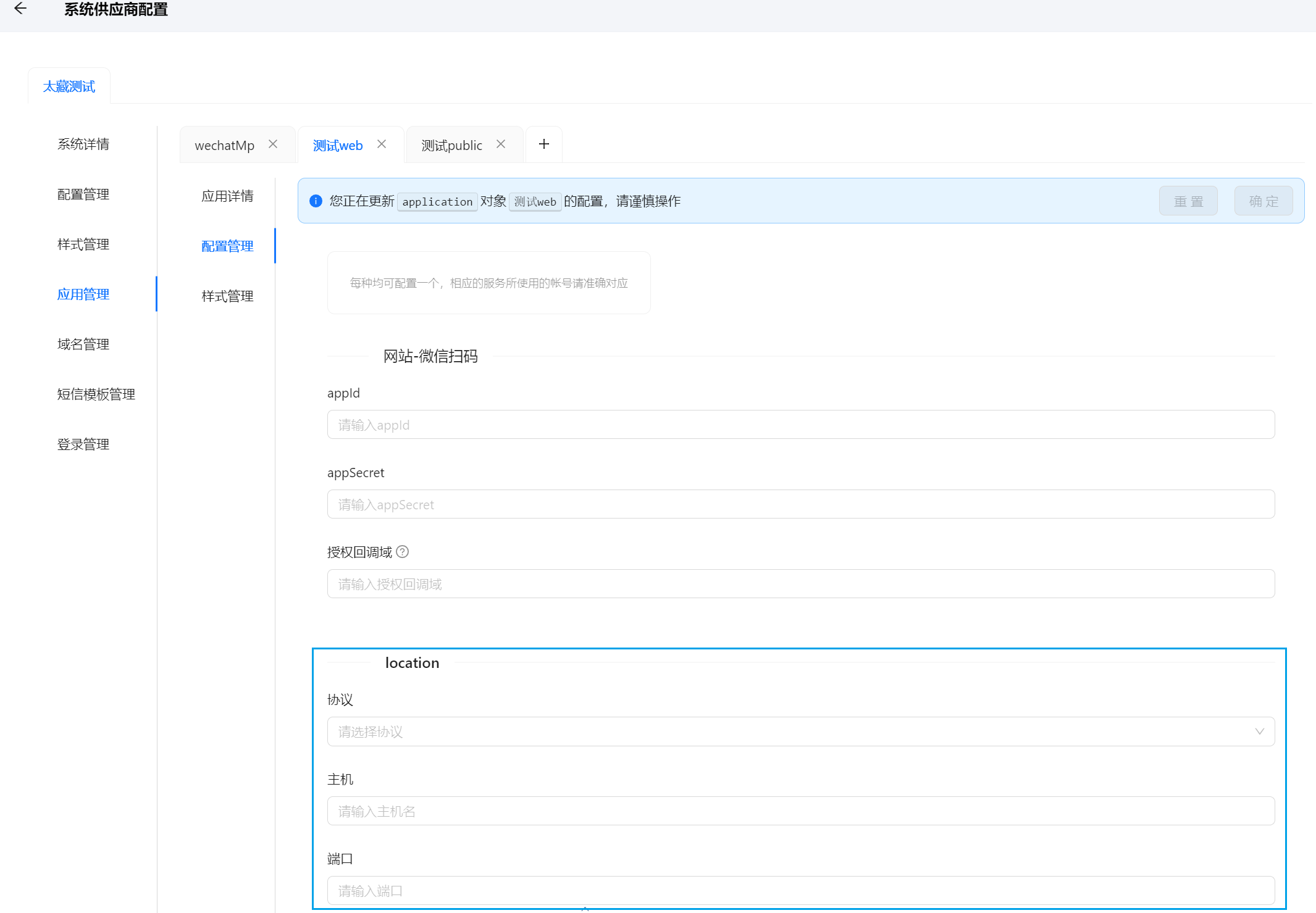 locationlocation: { protocol: 'http:' | 'https:'; hostname: string; port: string; }请根据具体项目在系统配置-应用管理-配置管理中完成location设置