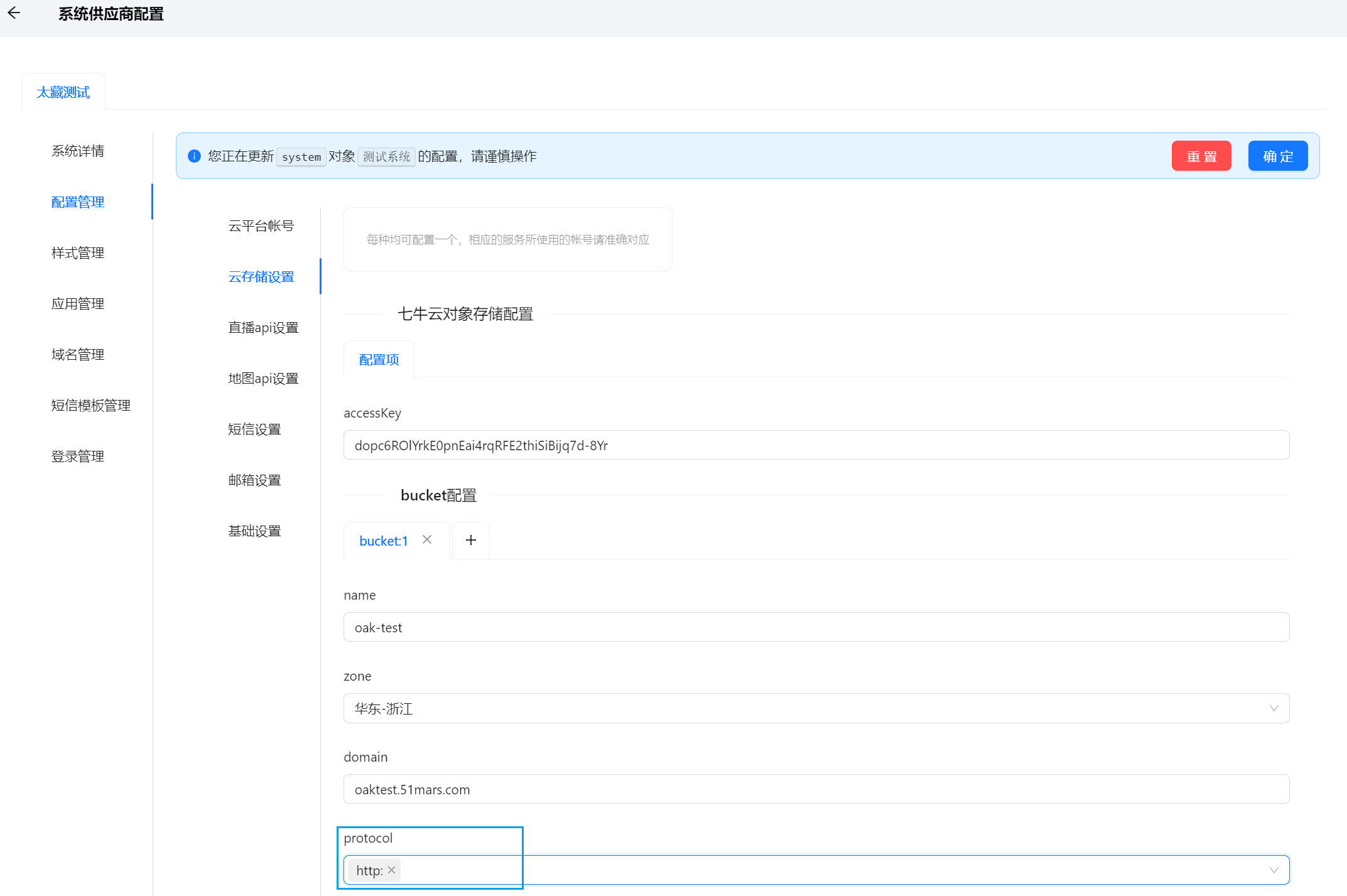 对domain对象的更新通过升级脚本完成。对system对象的更新请在系统配置-配置管理-云存储设置中更新bucket配置-protocol